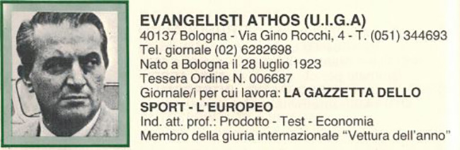 originale ingegnere, antesignano costruttore di una vetturetta elettrica e depositario (a suo dire) dei segreti della Ferrari. Alla Gazzetta dello Sport il settore industria dell’auto era affidato ad Athos Evangelisti,