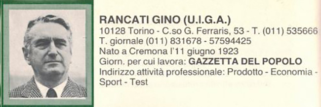 bell’uomo, bolognese perciò bon vivant, anche lui elegante, giornalisticamente molto abile e competente, capace di accattivarsi la confidenza dell’interlocutore, fosse l’Avvocato Agnelli o Lee Iacocca. La RAI, oltre che da Piero Casucci, signorile in ogni suo atteggiamento, era rappresentata da Gino Rancati,