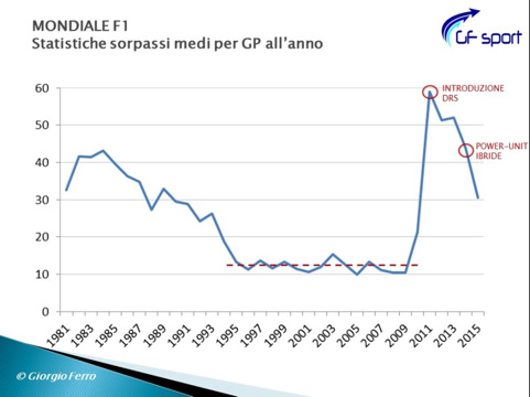 Prima di provare a capire quali sono le cause di questo fenomeno, andiamo però a verificare il numero medio di sorpassi avvenuti in ogni GP in un’intera stagione, certificando così che stiamo parlando di un fenomeno veramente esistente. E non di una fantasia.