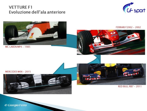Se scorriamo l’evoluzione tecnica delle vetture negli anni, notiamo che proprio l’ala anteriore è stata oggetto delle maggiori variazioni di forma, anche grazie a notevoli concessioni regolamentari. Nella figura seguente ho riportato a titolo esemplificativo quattro esempi di alettoni anteriori, dal 1985 a oggi. Passiamo dalla lineare semplicità della McLaren dell’85 all’estremizzazione di flap, deviatori e soffiaggi della Mercedes attuale. Nel corso degli anni l’impiego dei codici di aerodinamica computazionale ha infatti impresso un’accelerazione impressionante allo sviluppo e soprattutto ha concentrato l’attenzione sulla micro-ottimizzazione locale (e teorica) dei flussi e dei coefficienti di pressione.