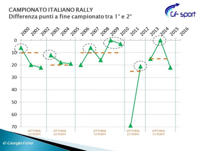 Certo abbiamo avuto anche qualche edizione in cui parlare di equilibrio sarebbe una bestemmia, come per esempio il 2011 quando Andreucci rifilò ben 69 punti di distacco a Rossetti e un centinaio a Cunico. Ma occorre anche precisare che quell’anno Paolo vinse ben 7 rally su 8. E in quei casi non c’è regolamento sportivo che possa “riequilibrare” le cose…