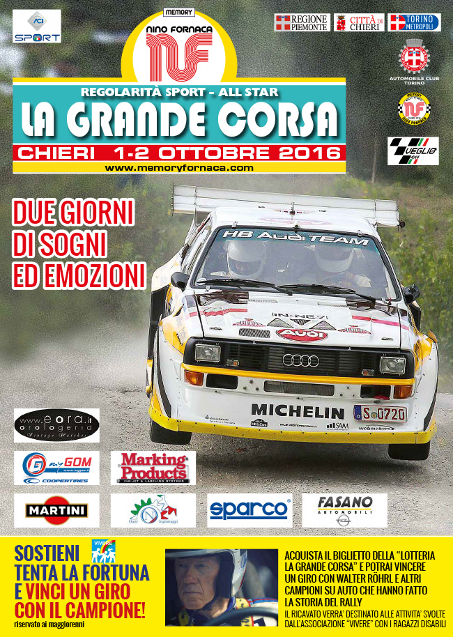 Il tedesco Walter Rorhl, due volte campione del mondo rally, sarà infatti l’ospite d’onore della “Grande Corsa “ ” Memorial Nino Fornaca” che prenderà il via dall’Arco di via Vittorio Emanuele II sabato 1 ottobre alle 20.30.
