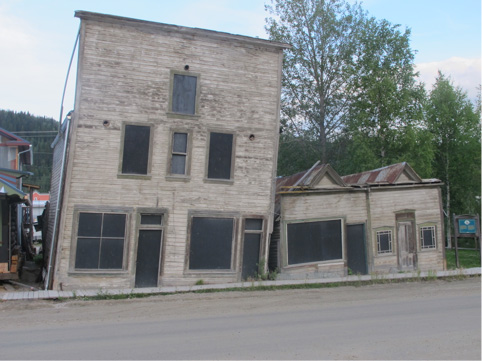 La Klondike Highway, nonostante il nome, è una normale strada a volte asfaltata ma anche con lunghi tratti di terra battuta, spesso attraversata da alci, bisonti e persino qualche orso. Segue esattamente il “Gold Rush Trail”, l’itinerario battuto dai cercatori d’oro, e arriva a Dawson City, al confine con l’Alaska, dove vennero scoperte quelle pepite che dettero il via alla seconda e “vera” corsa all’oro. Nel 1898 a Dawson City c’erano trentamila cercatori d’oro. Oggi i residenti fissi sono meno di duemila. Ma d’estate (il che significa luglio e agosto) sono almeno il triplo, perché arrivano dagli Usa e da altre parti del mondo molti giovani a lavorare. Ne abbiamo conosciuti alcuni ( tre americani e due ragazze canadesi) che hanno deciso di passare l’inverno a Dawson, con camera in albergo pagata facendo le pulizie. Ma a fine estate erano pronti a tornare a casa. Con una spiegazione : “Too much tv!”. Ma Dawson City, in estate s’intende, è un posto molto gradevole, con l’immancabile “Jack London Grill” , le case e le chiese sbilenche per le variazioni del terreno , che inevitabilmente risente del ghiaccio invernale e dello scioglimento nel breve periodo estivo. Come si vede da questa foto: