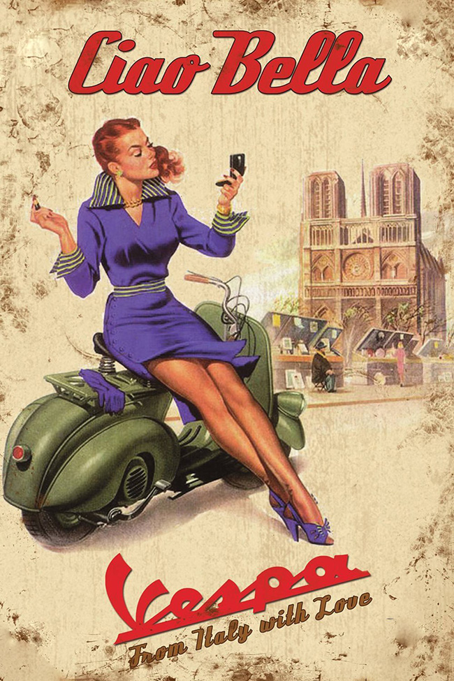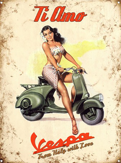 Fabbricata dall’India al Brasile, è diventata un fenomeno di costume, leggenda vivente dell’ingegno e del design italico, copiata in mille modi ed esposta al Moma di New York. E campionessa di vendite, con oltre 18 milioni di esemplari venduti dappertutto. «Per il vostro lavoro, per il vostro svago: “Vespizzatevi”», è il primo slogan della casa che anche in questo ha fatto storia. Le immagini conservate dal monumentale Archivio Storico Piaggio, che possiede oltre 150.000 documenti, meglio di qualsiasi discorso fanno capire come la Vespa attraverso le sue campagne pubblicitarie «abbia parlato alle famiglie – come spiegano a Pontedera – durante il boom economico, e ha saputo rivolgersi ai soggetti sociali emergenti: prima ai giovani, poi alle donne. Ha parlato di rivoluzione delle forme, di ecologia, di libertà, di estetica, di risparmio e convenienza, di relazioni. E lo ha fatto sia attraverso i grandi manifesti pubblicitari, sia usando prima il cinema e poi la Tv, fino all’avvento del Web nei giorni nostri». Tra tutti i messaggi, il più famoso, e surreale, «Chi Vespa mangia le mele (chi non Vespa no)», inventato nel 1969 da Gilberto Filippetti: divide il mondo e schiera lo scooter con i giovani. Tra i testimonial invece i migliori rimangono Gregory Peck e Audrey Hepburn in “Vacanze romane”, anche se sono decine le pellicole che l’hanno immortalata.